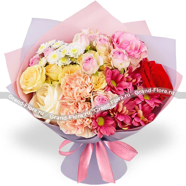 Стандартный: роза красная - 2 шт., роза розовая - 2 шт., роза белая - 2 шт., роза персиковая-1 шт., хризантема кустовая розовая - 1 шт.,хризантема кустовая ромашковая кремовая - 1 шт., роза кустовая розовая - 1 шт., кустовая роза кремовая - 2 шт., хризантема сантини - 1 шт., гвоздика персиковая - 2 шт., упаковка, лента.