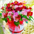 роза красная - 8 шт., роза кустовая розовая - 8 шт., эустома розовая - 3 шт.,гиперикум красный - 3 шт., декоративная зелень., оазис, коробка.